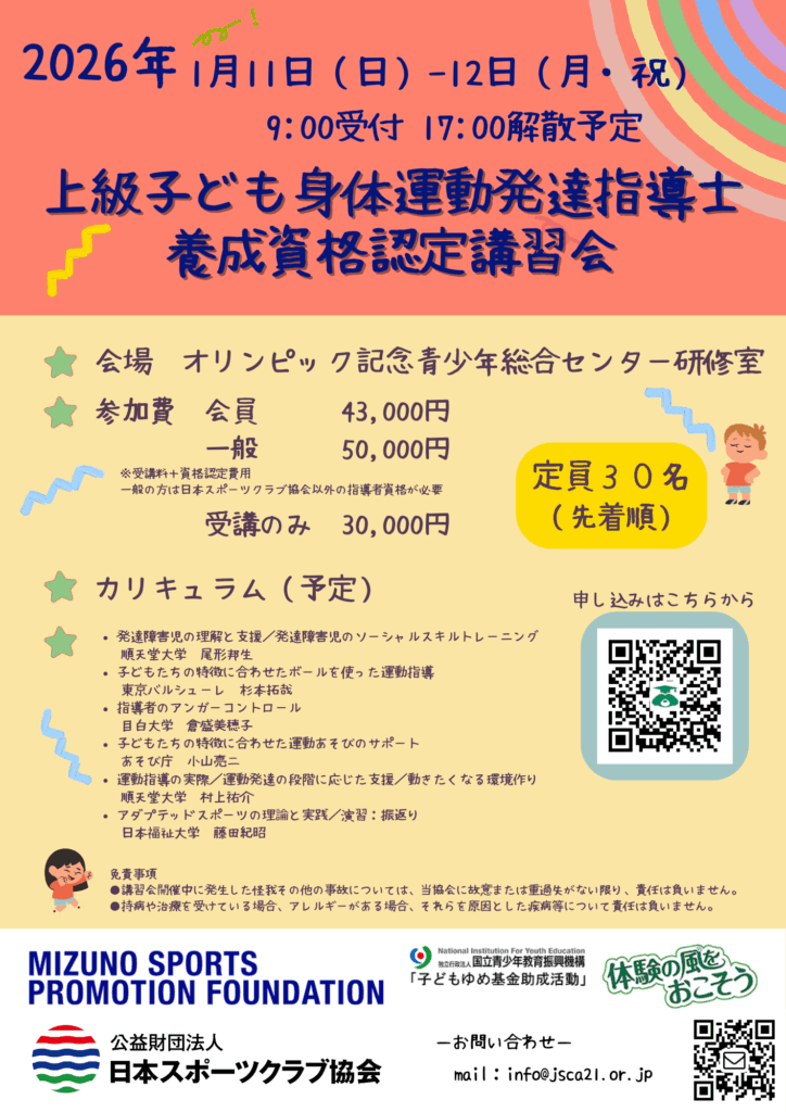【2026年1月11日-12日上級子ども身体運動発達指導士】養成講習会開催します。 2025.11.06 協会から 詳細は、資格紹介ページをご参照ください。 お申し込みは講習会管理サイトからお願いします。 お知らせ一覧へ