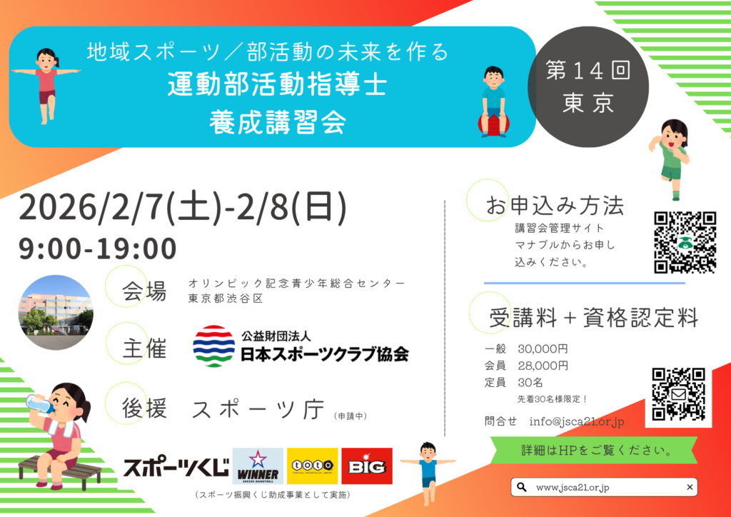 【2026年2月7日-8日】学校運動部活動指導士養成講習会開催します。 2025.12.03 協会から 申込は講習会申込サイトをご利用ください。 詳細は、資格紹介ページをご参照ください。 終日研修室を利用します。激しい活動はありませんが、実技が含まれておりますので動きやすい服装でご参加ください。 2日間で実施のため終了予定が20時となっております、あらかじめご承知おきください。 お知らせ一覧へ